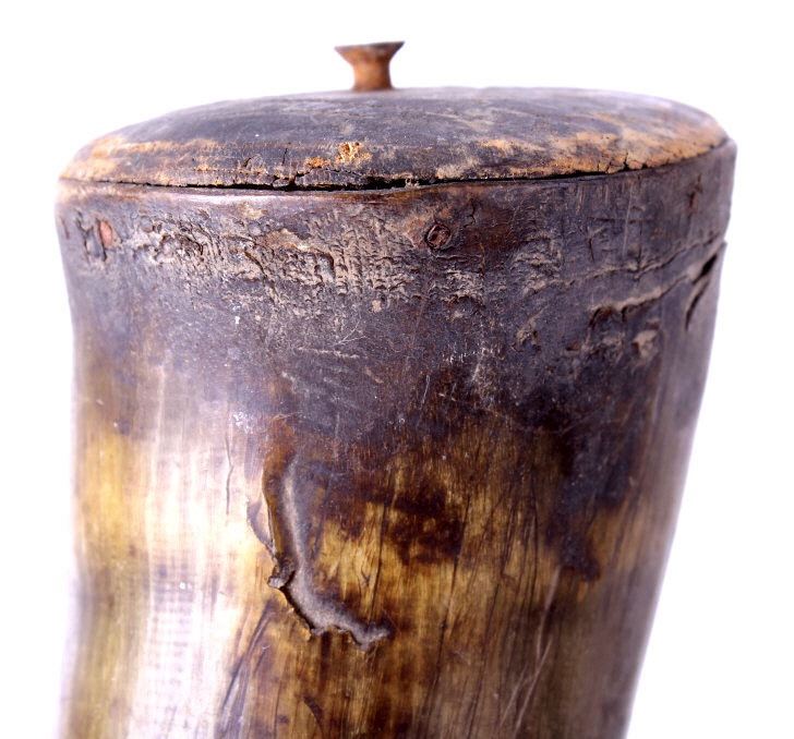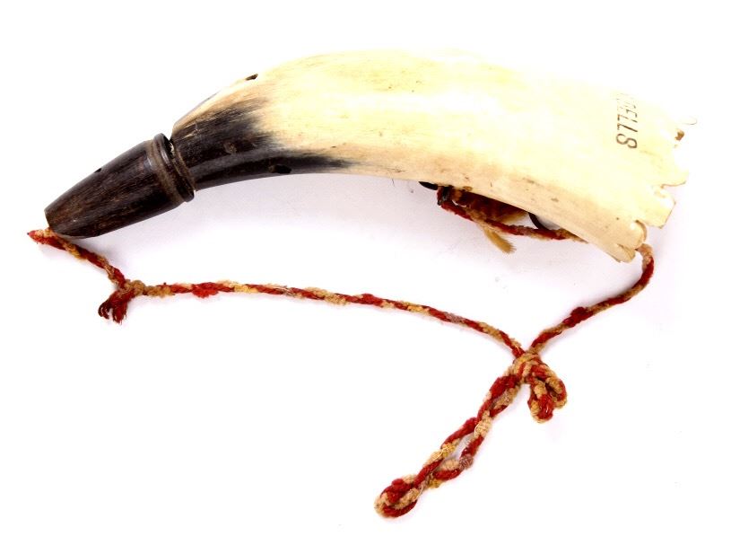 For your bidding pleasure are these Four Assorted Carved Powder Primer Horns. These Powder Horns are in fair condition with a couple cracks and one with no covering over the base of the horn. The largest of these horns is much darker than the rest, the next in size has a tan coloring getting lighter towards the base. Moving to the second smallest has the two cracks centered on the horn which is darer towards the nipple end and really light at the base. The smallest is in the poorest condition with a cracked base that is near white with a dark removable nipple. The measurements in description list order are 10" x 3" and 7 1/2" x 2" and 6 3/4" x 2" and 5 1/2" x 2".