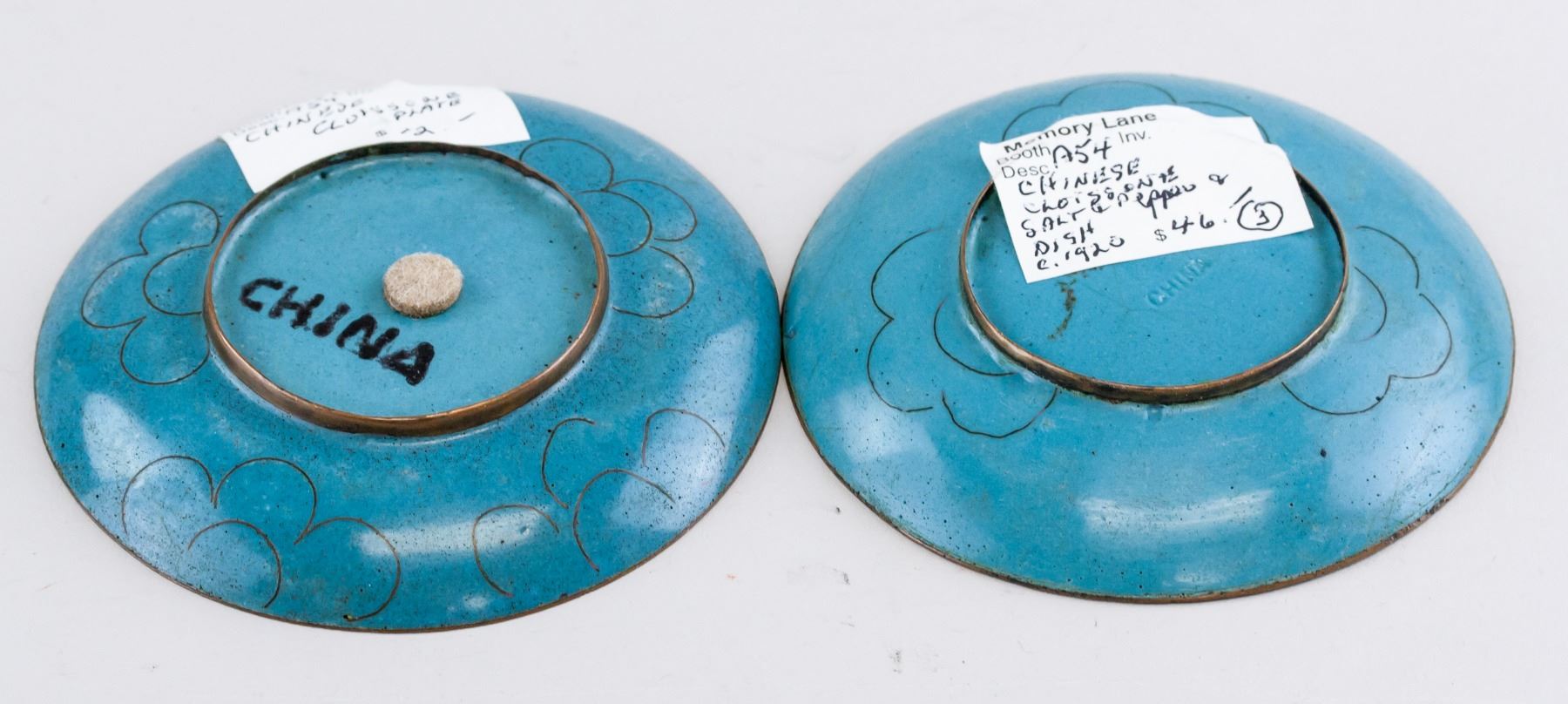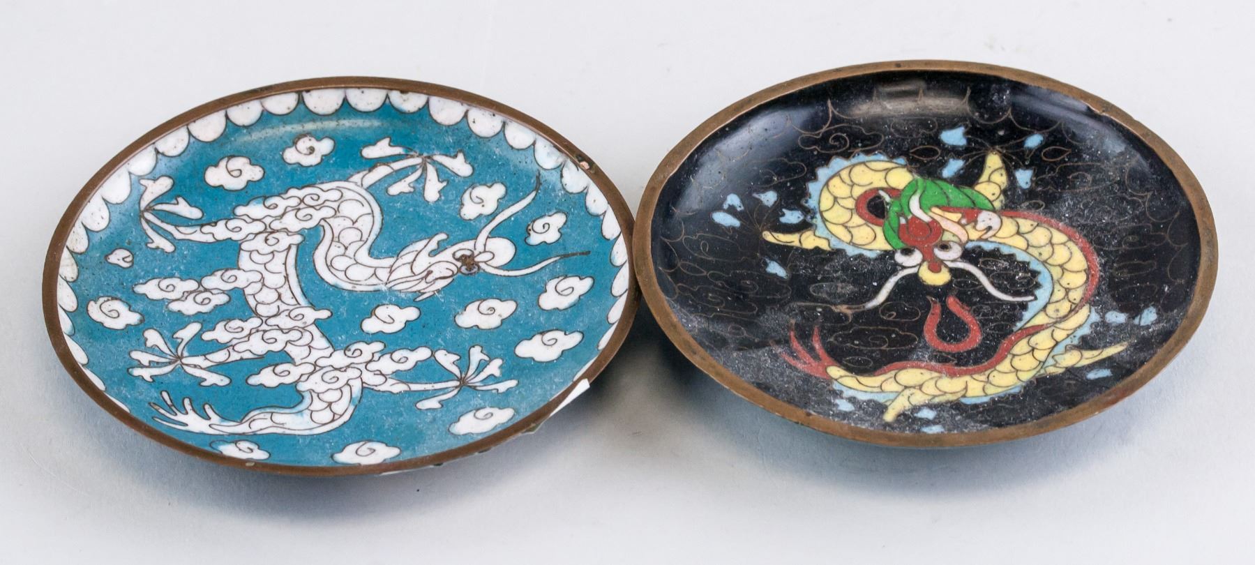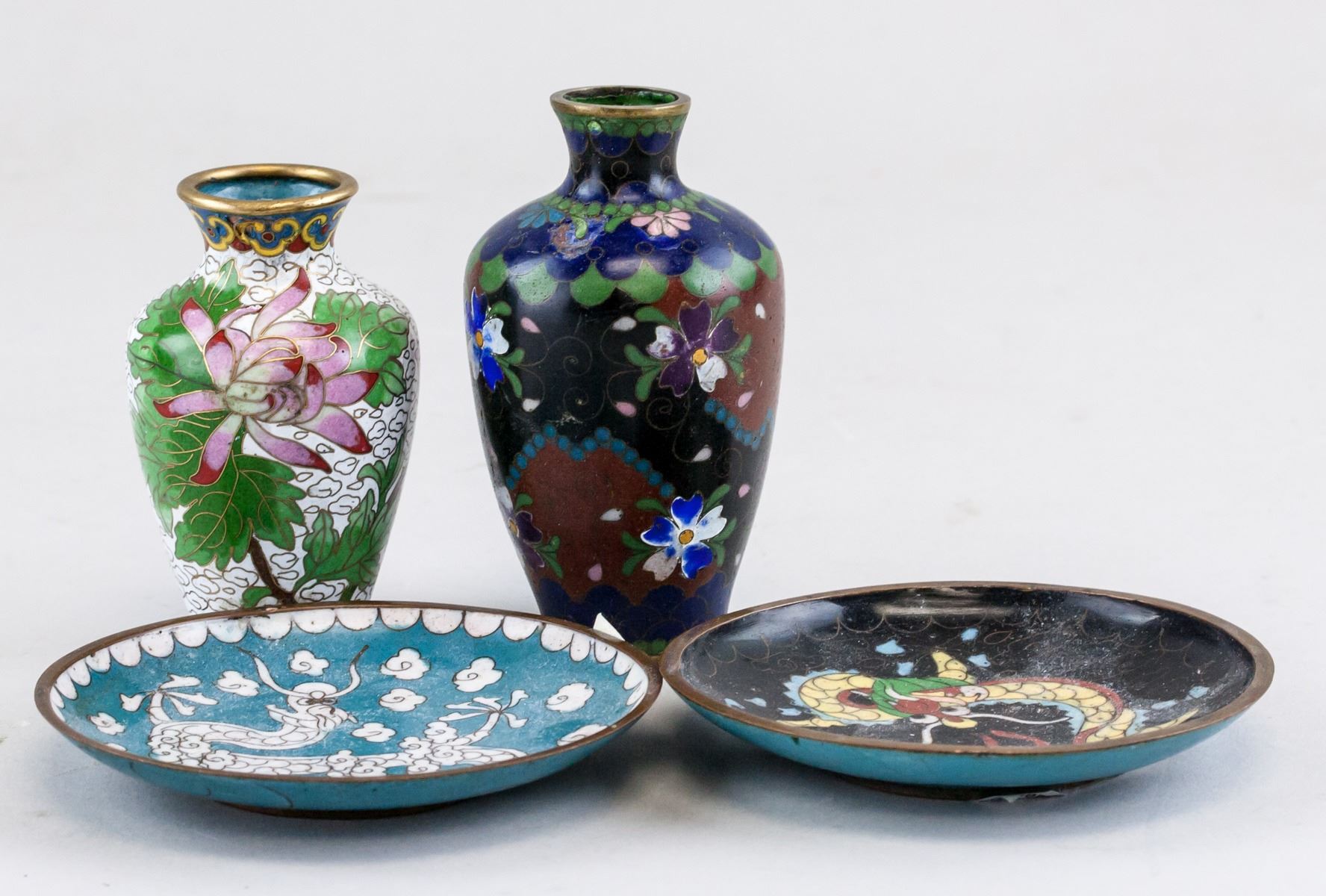 Four (4) assorted Chinese bronze cloisonne items. Of two vases, inlaid with floral pattern. Of two plates, inlaid with dragon. With previous seller Memory Lane stickers. 205 grams (total)