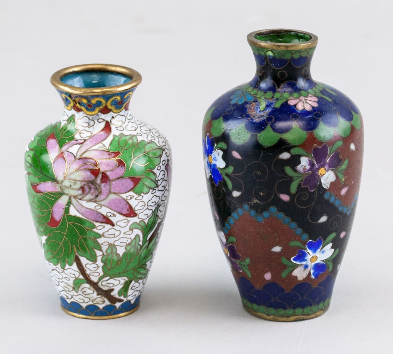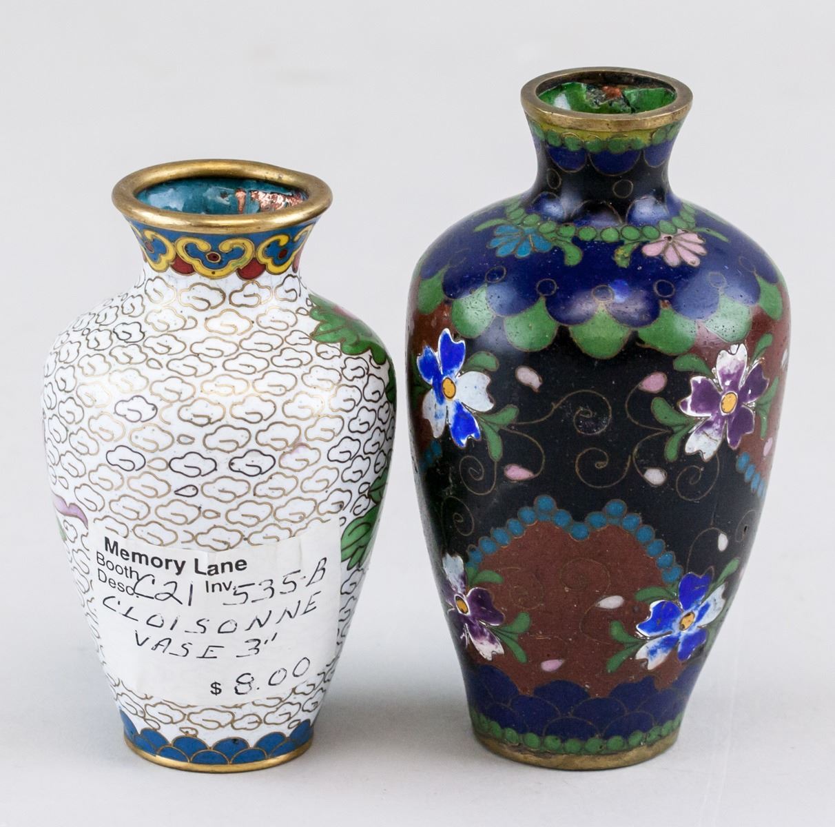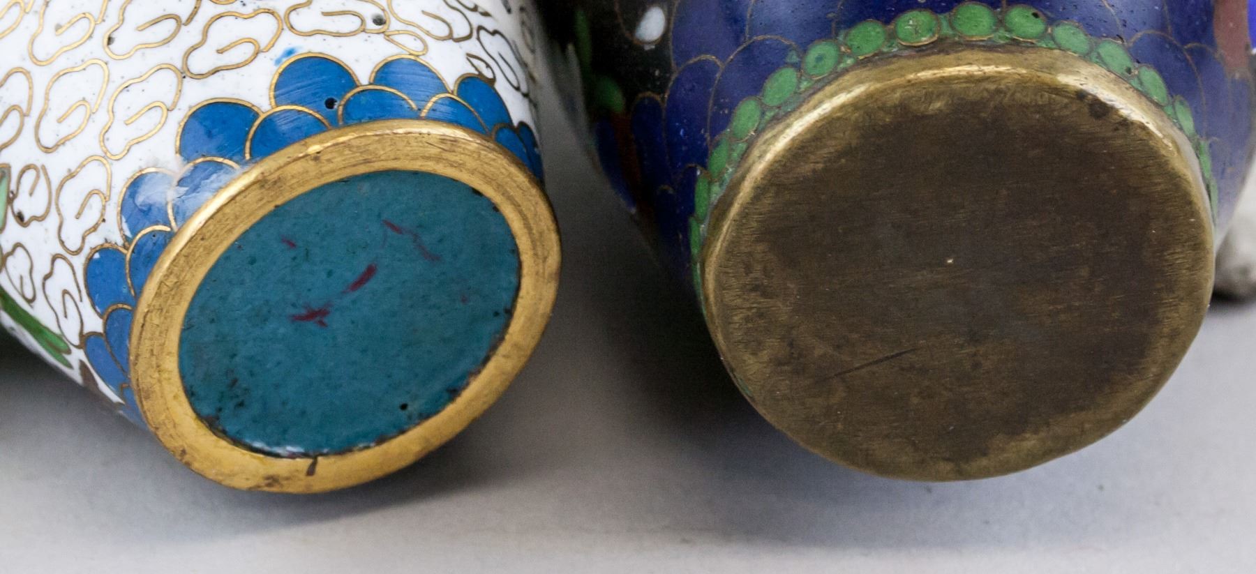 Four (4) assorted Chinese bronze cloisonne items. Of two vases, inlaid with floral pattern. Of two plates, inlaid with dragon. With previous seller Memory Lane stickers. 205 grams (total)