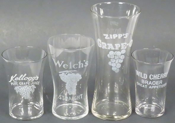 Four Assorted Juice Etched Fountain Glasses, Kellogg's Pure Grape, Zipp's Grape, Welch's Straight (lip chip) and Wild Cherry Bracer. Zipp's measures 5 1/4 inches tall