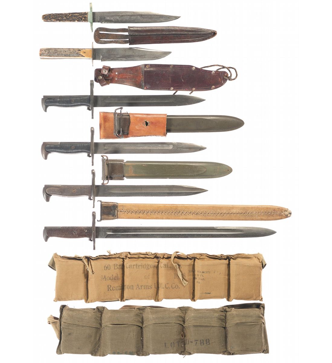 1 Springfield Armory 1903 bayonet marked "1908" with recovered sheath, 3 M1 Garand bayonets with 2 sheaths and 1 homemade frog (1 sharpened). 1 Romo "Original Bowie Knife" with antler grips and sheath (sharpened). 1 B.B. Knife Co. Bowie knife with antler grips and sheath (sharpened).1 sewed shut cloth bandolier marked "60 ball cartridges, cal., 30,/Model of 1898/Remington Arms U.M.C Co." with ammunition inside. 1 cloth bandolier with 10 stripper clips of 30-06 (corroded).