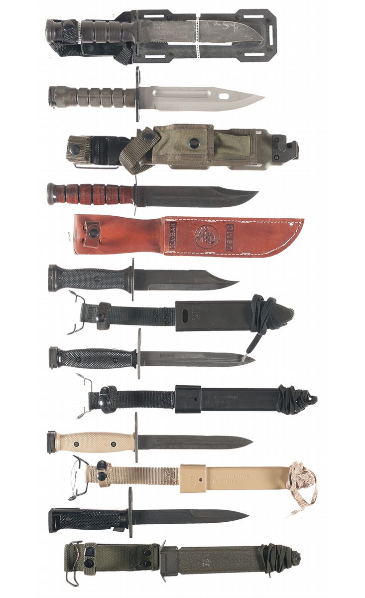 Bayonets: U.S. Imperial M6, M7(x2), Phrobis III M9. Bowie: U.S.N. Mark 3 Mod 0, Camillus, and U.S.M.C. marked Ka-Bar. All in very good or better condition.