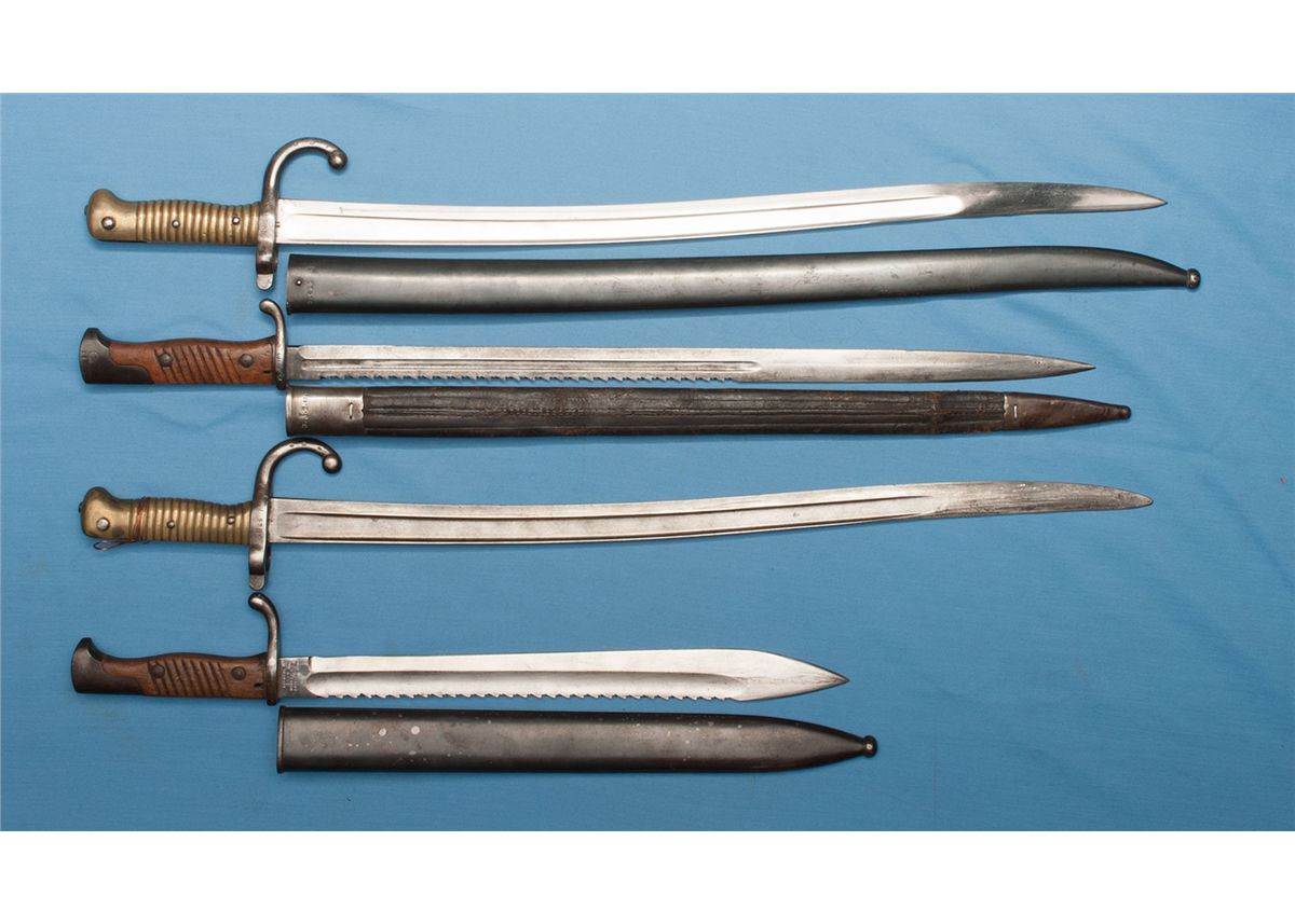 1) 25 ½ inch blade and metal scabbard. 2) 20 ½ inch blade and leather scabbard. 3) 22 ½ inch blade. 4) 14 ½ inch blade and metal scabbard. CONDITION: Good to very good overall.