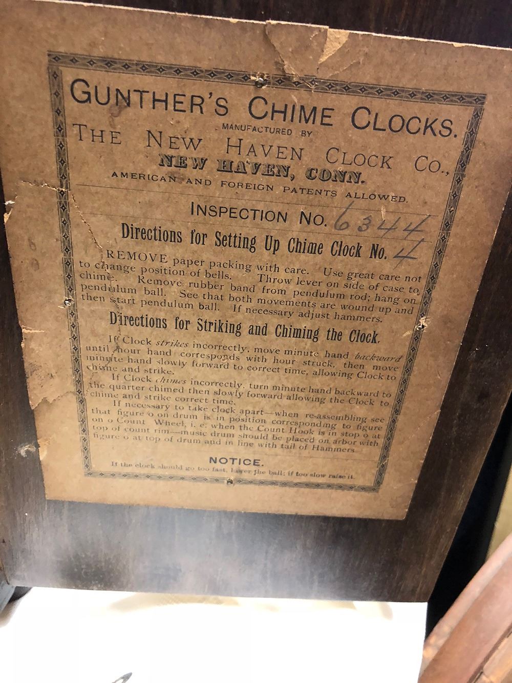 Four-Bell Westminster Chime Clock. Special Strking, plays on quarter hour, key wind and lever on side, which differentiates this clock from other mantel clocks. The New Haven Clock Co., New Haven, Conn., Gunther's Chime Clocks, paper label. Very uncommon clock in running condition. Measures approx. 21 1/2" tall.