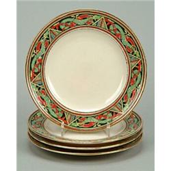 Four Belleek Third Period 'Celtic' pattern plates, the stylised pattern border reserved on a blac...