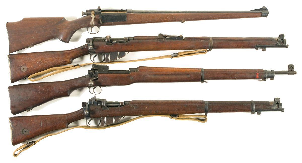 D) Right side of receiver ring marked "Crown/GR/Enfield/1922/ShtLE/V" with British proofs on left side receiver, trigger guard and stock behind trigger guard. Complete with detachable magazine and canvas sling.