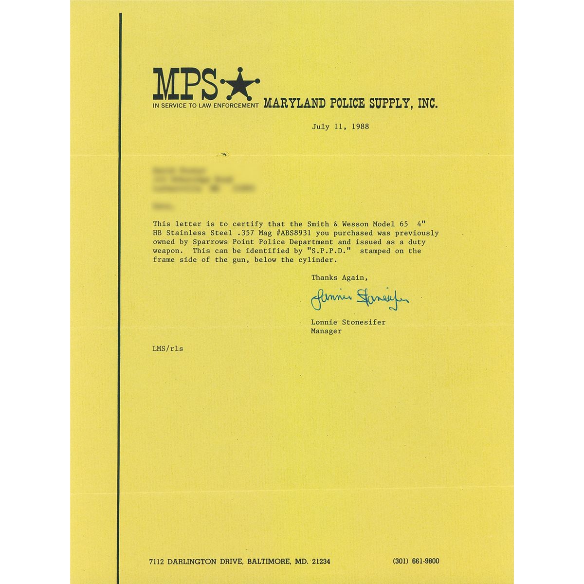 Introduced in 1974. Letter states that this revolver previously was owned by the Sparrows Point Police Department as denoted by the "S.P.P.D." marked on the left side of the frame. With box numbered to gun.