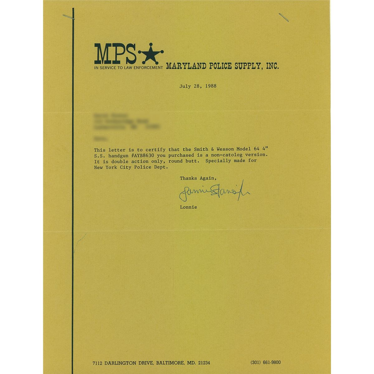 Introduced in 1970. This was specially made as double action only with a bobbed hammer for the New York City Police Department. The letter from Maryland Police Supply confirms this statement.