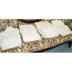 Four Boxes, Assorted Linens: Tableclothes, Runners, Napkins, etc. Some with Embroidered Initials. (Some Stains and Yellowing due to Age, Fair Condition.)