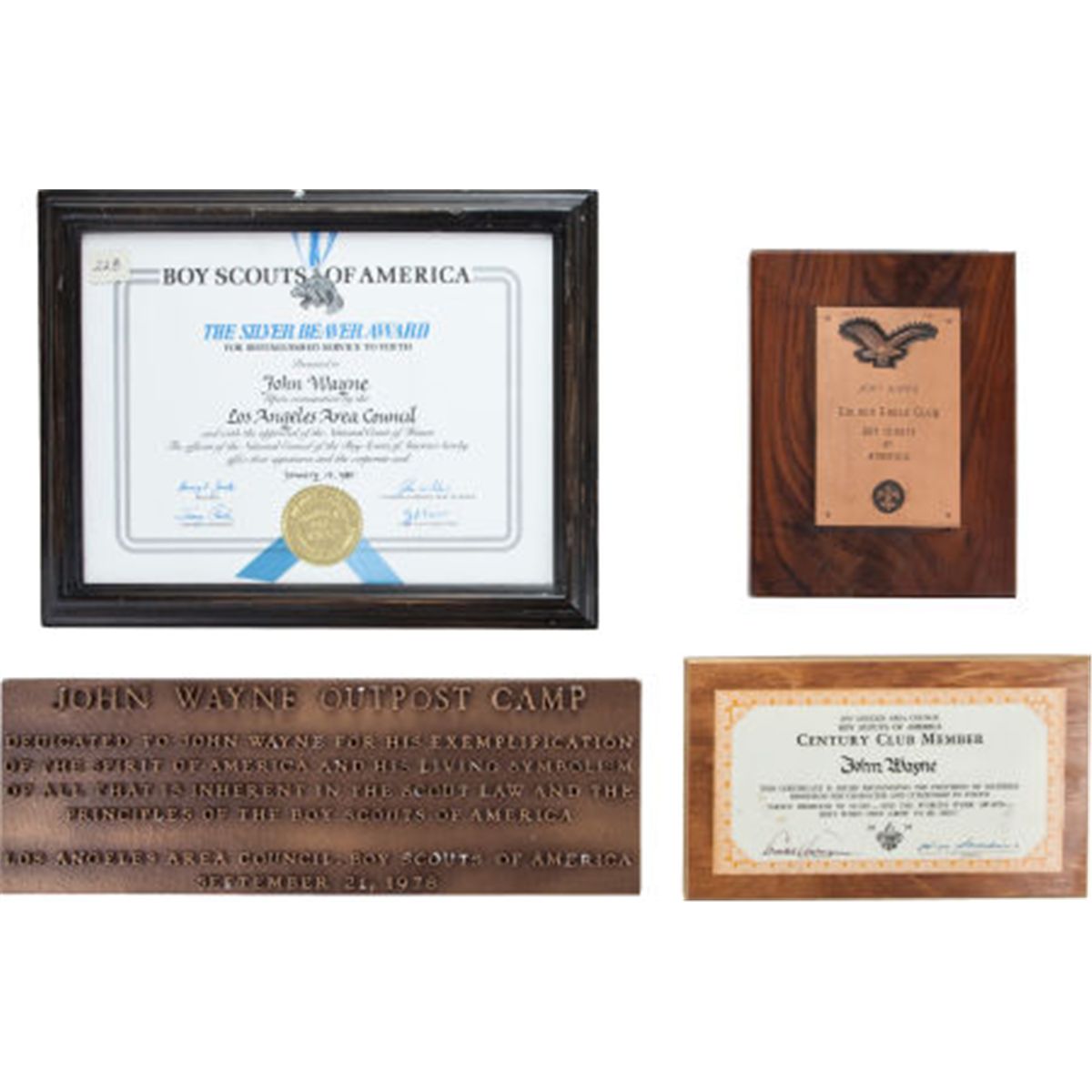 Four 'Boy Scouts of America' Awards, 1950s-1970s. All presented to John Wayne; the first from the Los Angeles Area Council for "..Distinguished Service to Youth" in 1980 (given to the Estate posthumously); the second from the Golden Eagle Club circa 1960s; the third from the Los Angeles Area Council for "...Exemplification of the Spirit of America" in 1978; and the fourth from the Los Angeles Area Council for becoming a "Century Club Member" in 1959; one with a JW inventory sticker. (Please go to our website to see detailed images of each piece.)10" x 13" and smaller