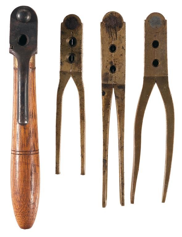Two brass 2 chamber (round and conical) bullet molds one marked "MASS ARMS CO." and the other marked "CHICOPEE FALLS" and one unmarked brass 2 chamber (round) bullet mold. Also included is a wood handled single cavity Starr Army .44 bullet mold.