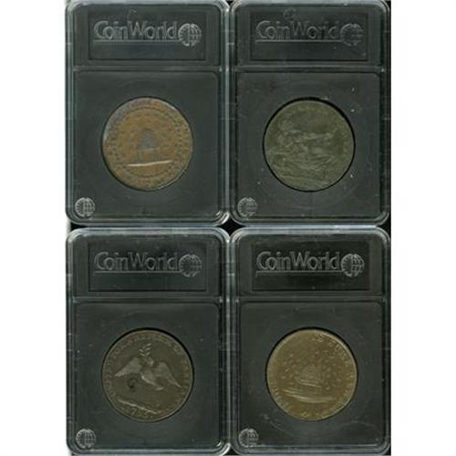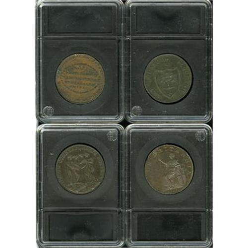 <B>Four British 18th Century Conder Tokens.</B></I> Four British Conder tokens issued during the late 1790s, covering a wide range of topics and themes. Great lot for a starter collection of this interesting and epochal period of British history..<BR><BR><b>Shipping:</b> Coins & Currency (<a target="_blank" href="http://www.heritageauctions.com/common/shipping.php">view shipping information</a>)