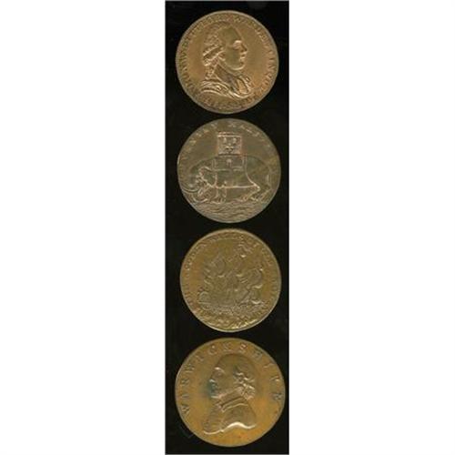 <B>Four British 18th Century Conder Tokens.</B></I> A nice group of four high-end British Conder tokens dating from the late 1790s: a <B>1793 Lady Godiva; </B></I>a <B>1791 Warwickshire </B></I>piece with Wm. Shakespeare, plain edge; <B>Fred. Duke of York 1795 halfpenny, Uncirculated; </B></I>and a <B>William Pitt 1794 Cinque ports </B></I>token, <B>Uncirculated.</B></I><BR><BR><b>Shipping:</b> Coins & Currency (<a target="_blank" href="http://www.heritageauctions.com/common/shipping.php">view shipping information</a>)