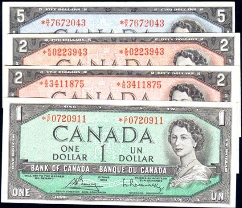 Bank of Canada 1954 One Dollar Bouey-Rasminski, BC-37cA Serial Number *C/F0720911, EF-AU. Plus 1954 Two Dollars Bouey-Rasminski, BC-38cA Serial Number *A/G3411875, EF and 1954 Two Dollars Lawson Bouey, BC-38dA Serial Number *K/G0223943, VF. Plus 1954 Five Dollars, Bouey-Rasminski, BC-39cA Serial Number *R/X7672043, VF-EF. Total of four replacement notes