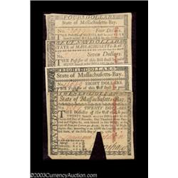 <TABLE cellSpacing=0 cellPadding=0 width="100%" bgColor=#000000 border=0><TBODY> <TR><TD width="100%"><TABLE cellSpacing=1 cellPadding=3 width="100%" border=0><TBODY><TR><TD width="100%" bgColor=#79735c><FONT face=arial color=#ffffff size=3><B>Description</B> </FONT></TD></TR><TR><TD width="100%" bgColor=#ffffff><FONT face=arial size=2><B>Four Cancelled Massachusetts Notes.</B></I> All four high grade pieces are from the May 5, 1780 issue: $4 with a dime sized hole cancel, $7 with a diamond shaped cancel, $8 with a dime sized hole cancel, and $20 with a pie-wedge cut-out cancel. All four notes grade <B>About Uncirculated</B></I> or better. (300--up) (4 notes) </FONT></TD></TR></TBODY></TABLE></TD></TR></TBODY></TABLE><BR><TABLE cellSpacing=0 cellPadding=0 width="100%" bgColor=#000000 border=0><TBODY><TR> 4 notes Important notice: Heritage usually auctions material at the rate of 200-250 lots per hour. On some occasions eBay Live bid software or the Internet may not be able to keep up with the pace of the auction. We recommend placing a realistic absentee bid now as insurance to avoid disappointment. Occasionally the auctioneer may eliminate or reject an eBay Live bid, and the auctioneer may also reopen a lot after the close of the eBay live bidding (usually because we missed an audience bid), and may reject your bid even if it shows you as the winning bidder. By bidding via eBay Live, you agree that Heritage may award the lot to another bidder at its sole discretion under the circumstances described above or any other reasonable circumstances. Also please note that all Heritage lots purchased through eBay Live carry a 20% Buyer's Premium. Please make sure you read the Terms and Conditions before you bid.</TR></TBODY></TABLE>