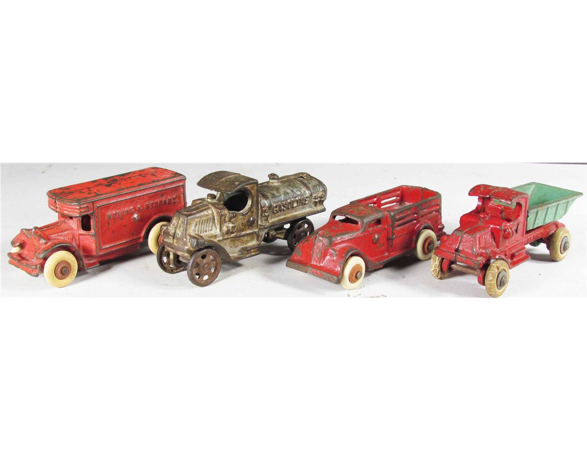 Four Cast Iron Toy Trucks. Moving & Storage, red. Gasoline Tanker, silver. Stake Bed, red. Champion red/green dump. Overall good original condition. Approx.. 5 inches long.