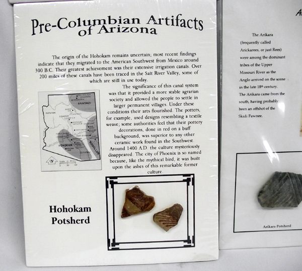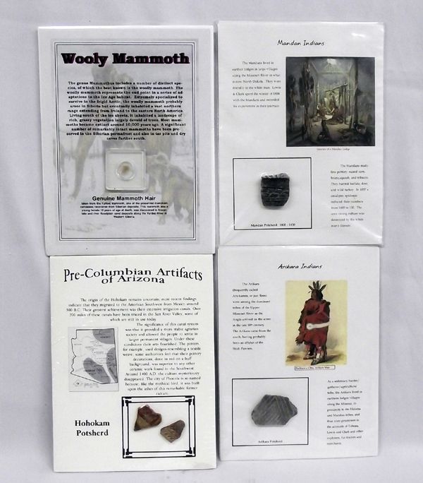 Four Catalogued and Authenticated Artifacts. This lot contains four items: 1. Mandan Potsherd, 1800-1830, Missouri River, in what is known as North Dakota. 2. Hohokam Potsherd, Pre-Columbian artifact of Arizona. 3. Arikara Potsherd, Upper Missouri River. 4. Genuine Wooly Mammouth Hair from the Yuribej River in Western Siberia.