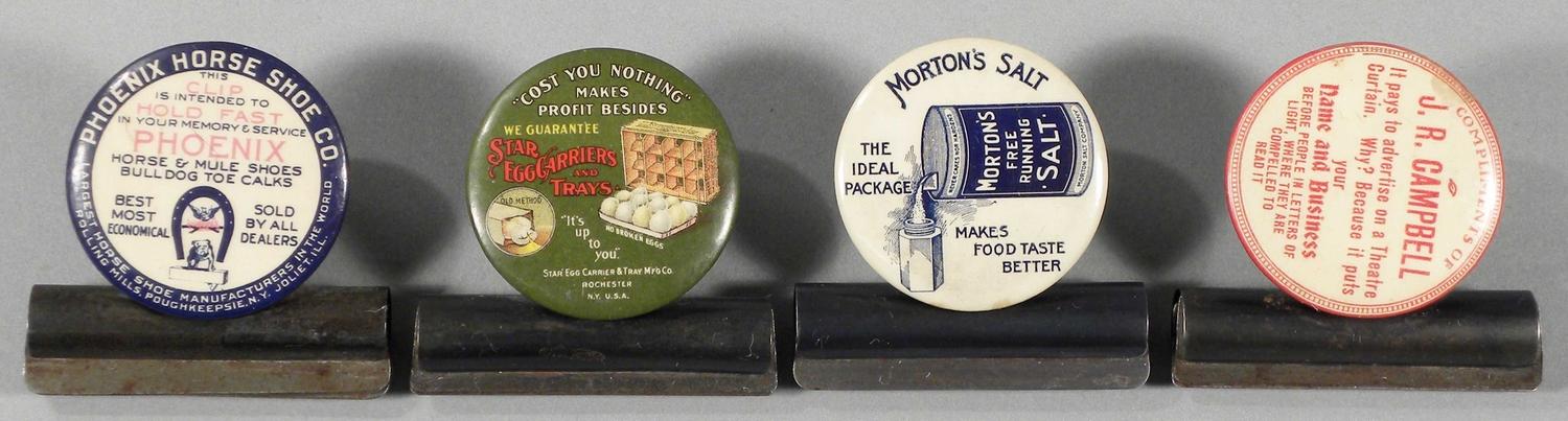 Lot of Four Celluloid Advertising Paper Clips including Phoenix Horse Shoe Company, Joliet, ILL. Star Egg Carriers and Trays, Rochester, NY. Morton's Salt and J.R. Campbell Advertising Company. First three in excellent condition, Campbell has some slight discoloration at 11:00 otherwise very good condition. Badge measure 1 3/4inch diameter. Start Price $70