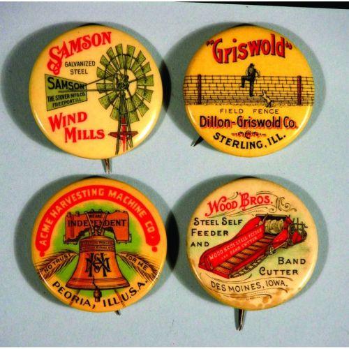 Four Celluloid Pinbacks including Samson Wind Mills, Freeport, IL, Griswold Fences-Sterling, IL, Acme Harvesting Machine Company, Peoria, IL and Wood Brothers Steel Feeder and Band Cutter-Des Moines, IA. Excellent condition. 1 1/4 inch diameter.