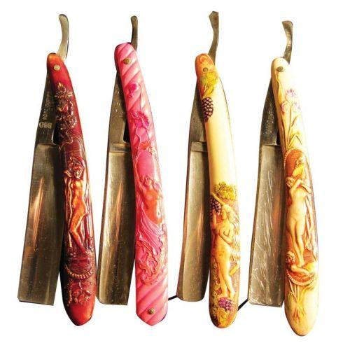 Lot of four celluloid handled straight razors including nude with tulips, nude with grapes, nude with poppy, and nude with brown handle. All in Excellent condition.