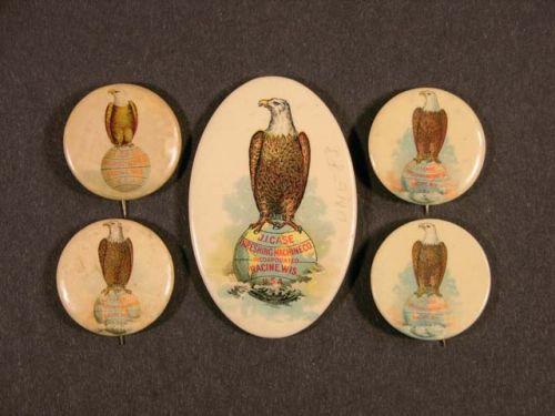 Four Celluloid pin backs and 1 pocket mirror from the J.I. Case Threshing Machine Co., All ex. cond.