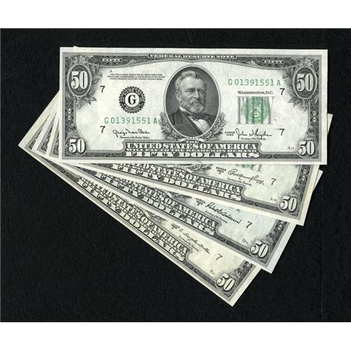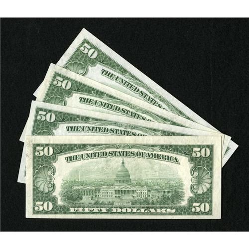 <B>Four Chicago District Notes from the 1950's:</B></I><BR>Fr. 2107-G $50 1950 Federal Reserve Note <B>Choice AU</B></I><BR>Fr. 2108-G $50 1950A Federal Reserve Note <B>Choice AU</B></I><BR>Fr. 2109-G $50 1950B Federal Reserve Note <B>Choice AU</B></I><BR>Fr. 2109-G $50 1950C Federal Reserve Note <B>Choice AU.</B></I><BR><BR><I>From The Bill and Kathy Stella Currency Collection</B></I><BR><BR><b>Shipping:</b> Coins & Currency (<a target="_blank" href="http://www.heritageauctions.com/common/shipping.php">view shipping information</a>)