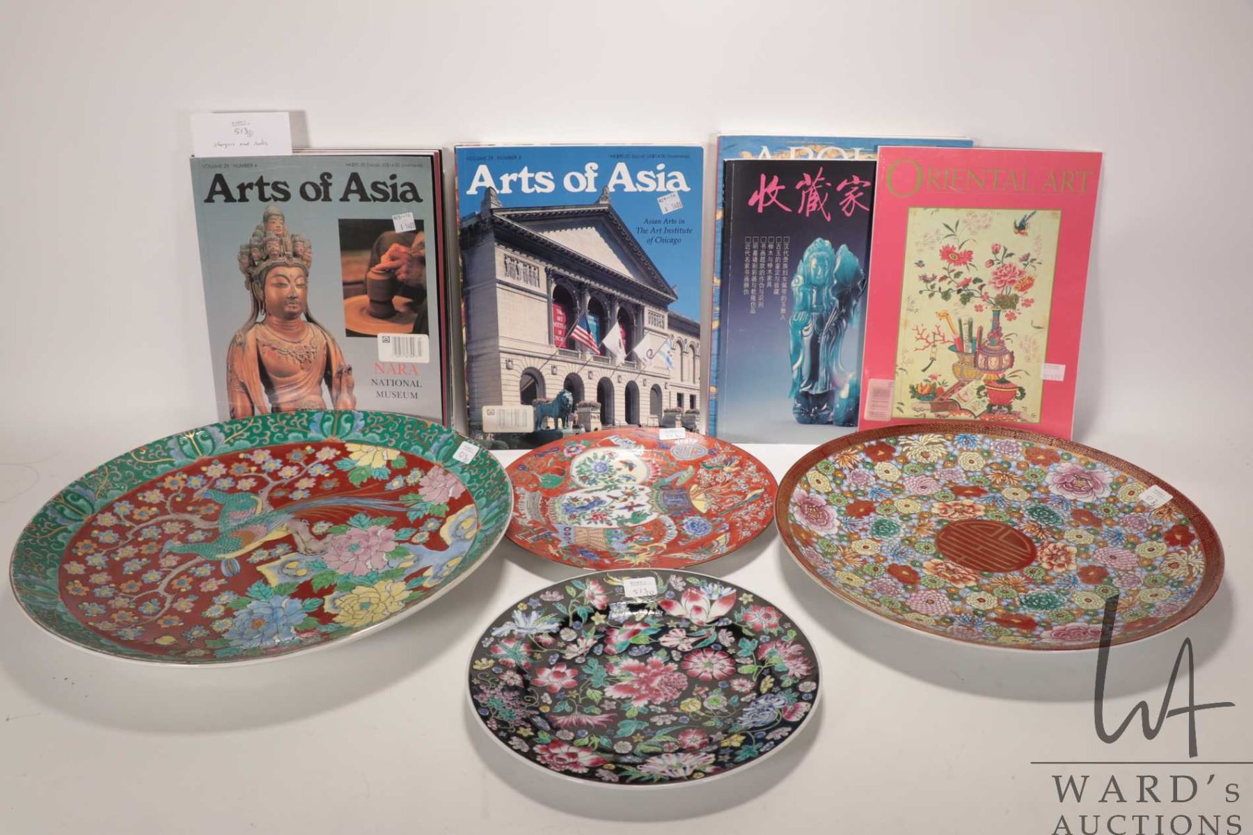 Four Chinese and Japanese chargers 10" to 16" and a selection of Arts of Asia books