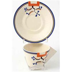 Four Clarice Cliff 'Ravel' pattern teacups and saucers, conical cups with solid, triangular handles, one cup cracked, £80-120