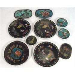 Four Cloisonne plates decorated with butterflies, three rectangular and three circular Cloisonne dishes, decorated with birds and flowers, largest 18cm diameter