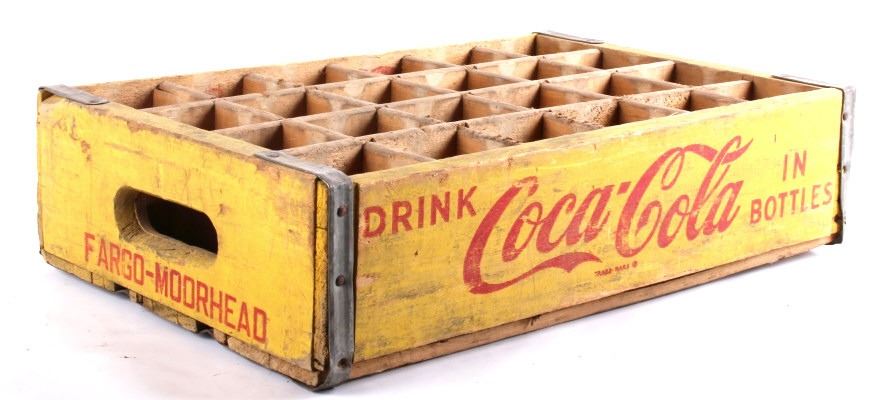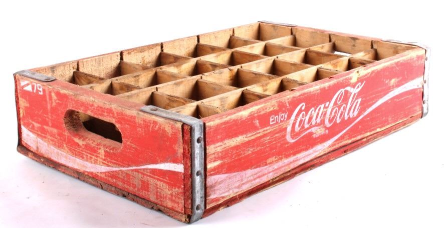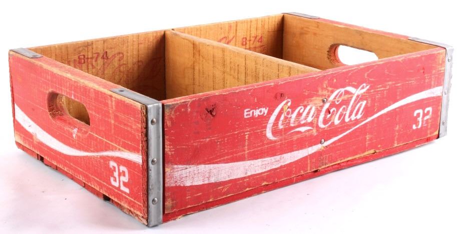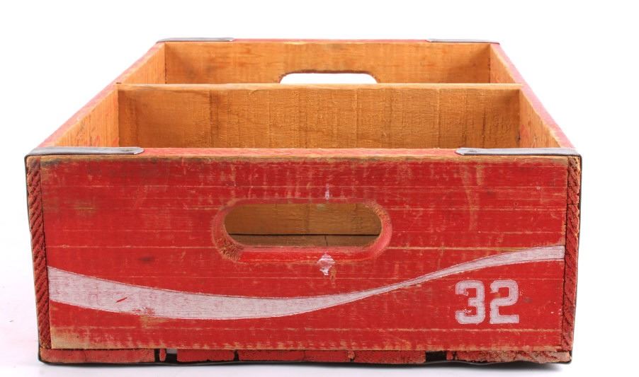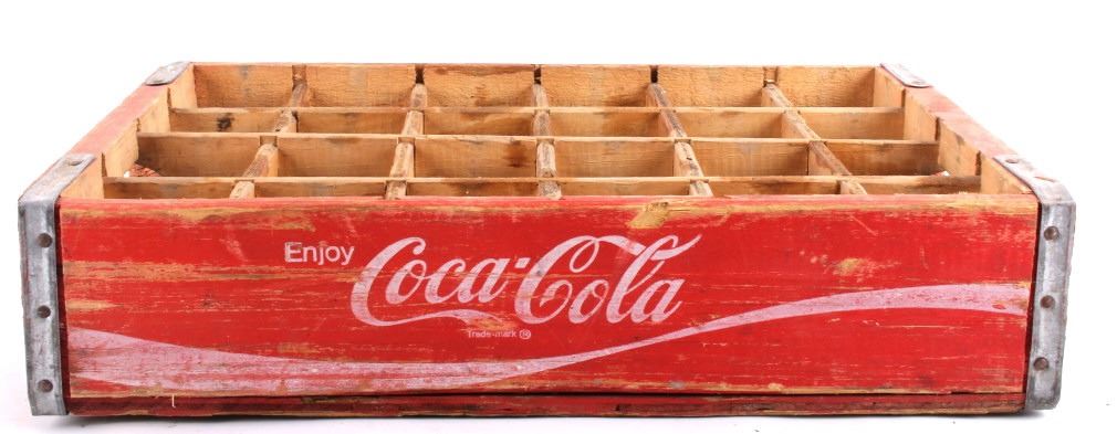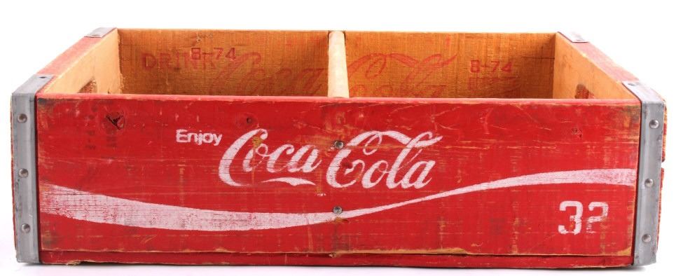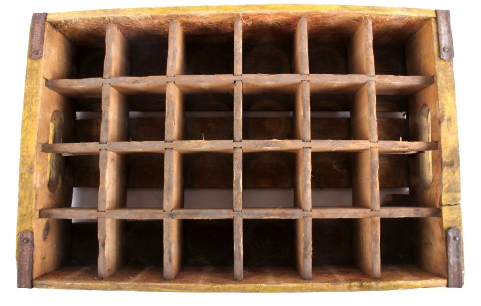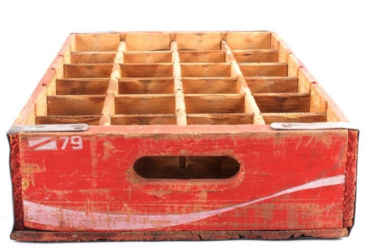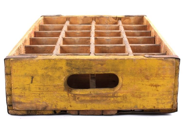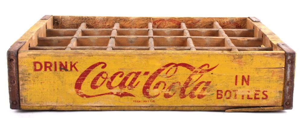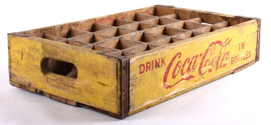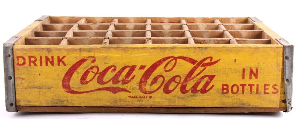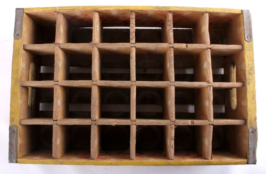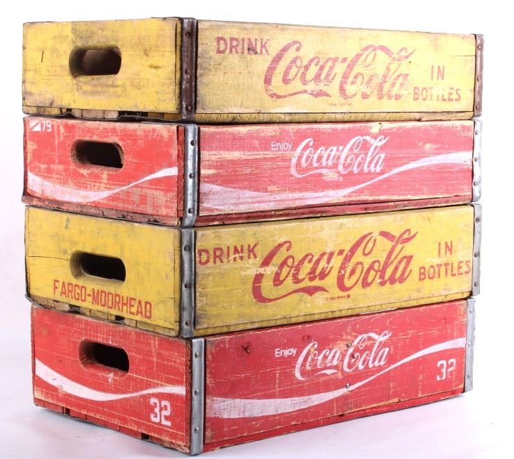 Here are 4 Coca- Cola crates, 3 are divided for 24 bottles and the other is for 32oz. bottles. Two of the divided crates are yellow and from 1967, the red one is from 79. The 32oz crate is red in color is marked 1974. The crates measure 18 1/2"W x 12"L x 4"H