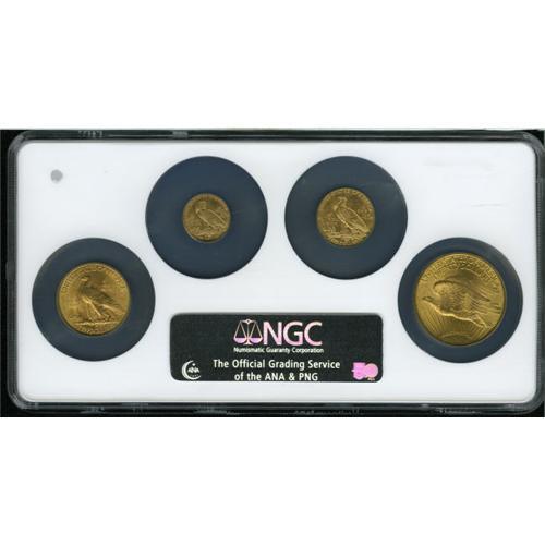 <B>Four Coin Indian and Saint-Gaudens Gold Type Set. MS63 NGC.</B></I> This four coin set consists of a 1925-D quarter eagle, a 1908-D half eagle, a 1932 eagle, and a 1924 double eagle. All four coins are held in a single NGC holder that bears the MS63 grade.<BR><BR><b>Shipping:</b> Coins & Currency (<a target="_blank" href="http://www.heritageauctions.com/common/shipping.php">view shipping information</a>)