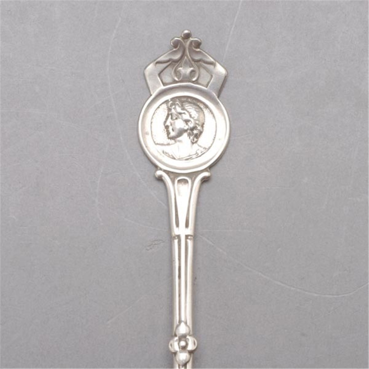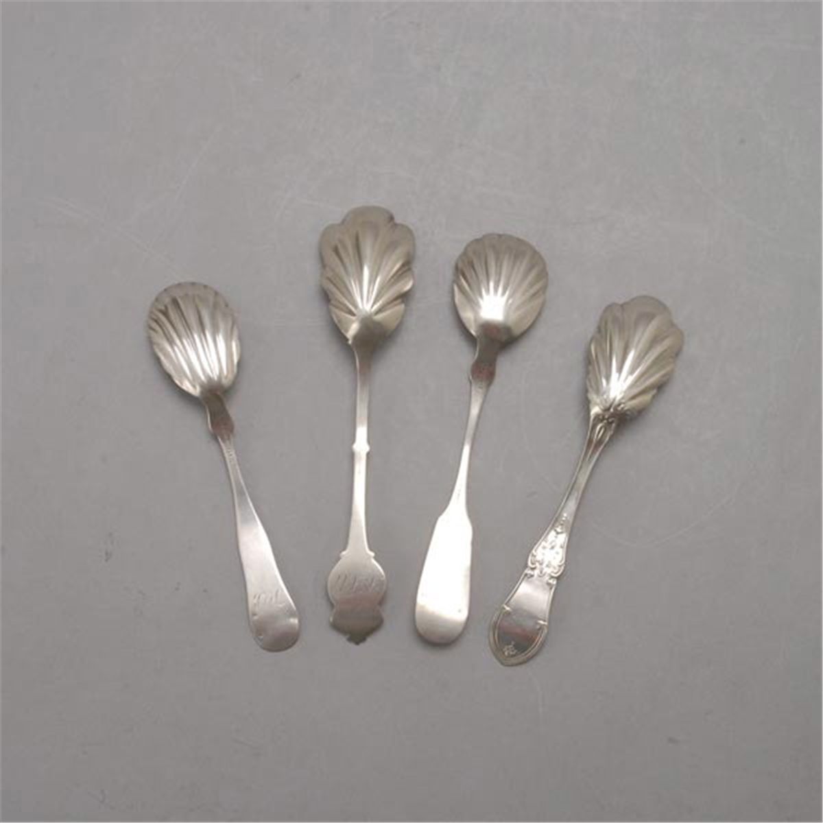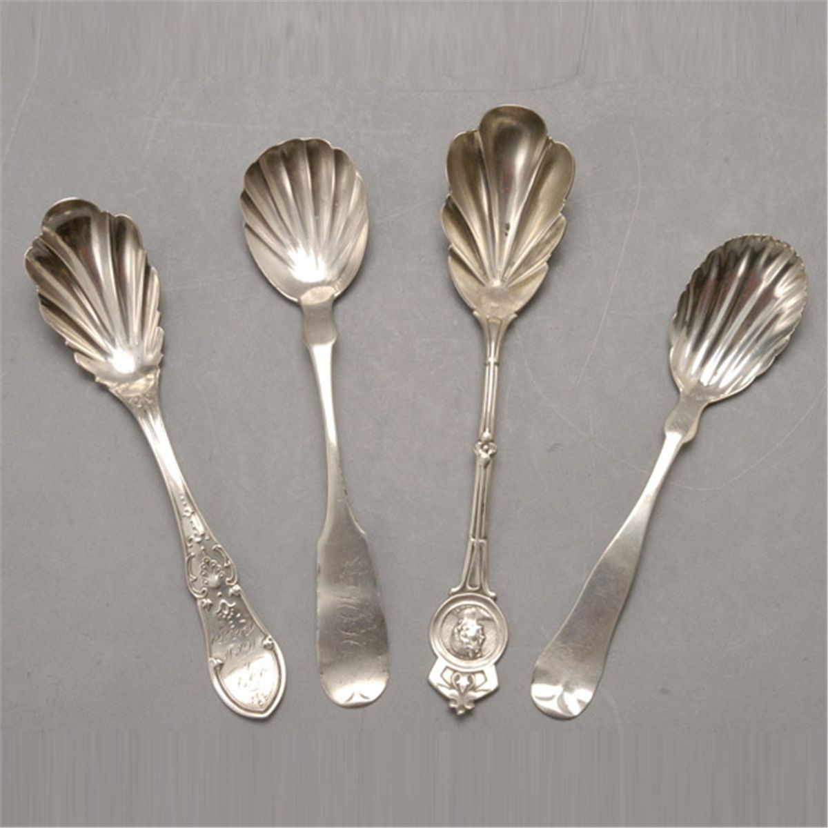 Four Coin Silver Sugar Shells, including one with portrait medallion {Total silver weight 2.73 troy oz; length of longest 6 3/4 inches}