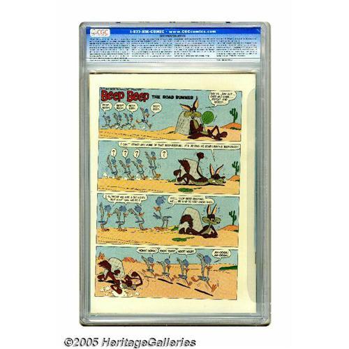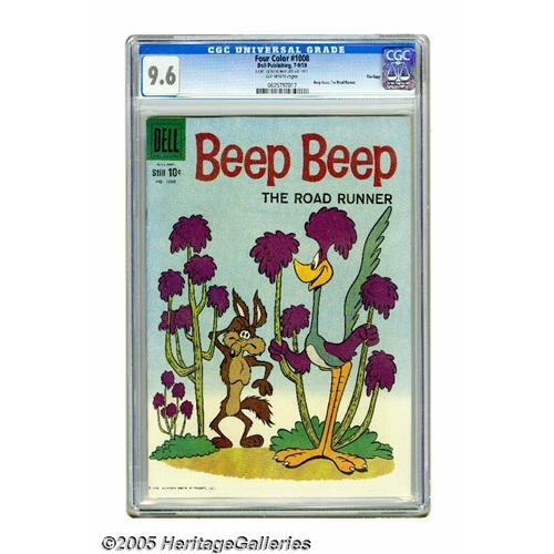 <B>Four Color #1008 Beep Beep the Road Runner - File Copy (Dell, 1959) CGC NM+ 9.6 Off-white pages.</B></I> Overstreet 2005 NM- 9.2 value = $80. CGC census 7/05: 2 in 9.6, none higher. <I>From the Random House Archives.</B></I> <BR><BR><B>Important notice:</B> Heritage usually auctions material at the rate of 200-250 lots per hour. On some occasions eBay Live bid software or the Internet may not be able to keep up with the pace of the auction. We recommend placing a realistic absentee bid now as insurance to avoid disappointment. Occasionally the auctioneer may eliminate or reject an eBay Live bid, and the auctioneer may also reopen a lot after the close of the eBay live bidding (usually because we missed an audience bid), and may reject your bid even if it shows you as the winning bidder. By bidding via eBay Live, you agree that Heritage may award the lot to another bidder at its sole discretion under the circumstances described above or any other reasonable circumstances. Since eBay bids are not shown to us until we open the lot on the floor, we treat those bids just like floor bids. In most cases the floor responds before the eBay bid is presented to us, due to Internet lag time, so for consistency we have made it a policy that floor bids are always considered first over tie eBay live bids. Also please note that all Heritage lots purchased through eBay Live carry a 20% Buyer's Premium. Please make sure you read the Terms and Conditions before you bid. This lot is being auctioned in conjunction with a live floor auction by Heritage Galleries & Auctioneers. All final auction and invoice information will be supplied by Heritage Galleries & Auctioneers, and all other information should be considered preliminary. Lot:3176 <BR><BR><B>Winning Notification and Billing:</B> After the FINAL session in this auction is complete, Heritage will send e-mail and snail mail invoices. This process normally takes several days. All final auction and invoice information will be suppl