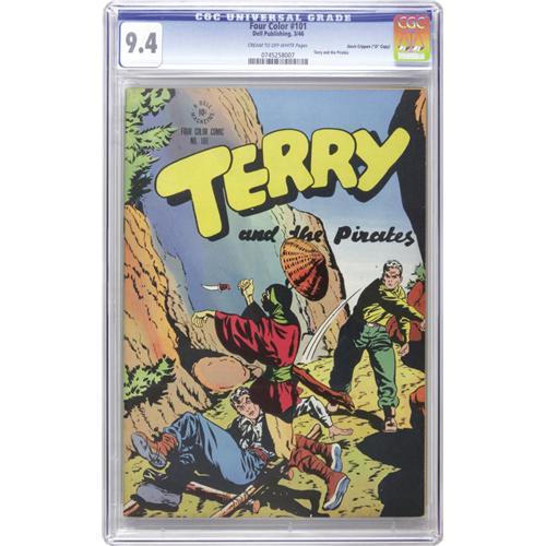 <B>Four Color #101 Terry and the Pirates - Davis Crippen ("D" Copy) pedigree (Dell, 1946) CGC NM 9.4 Cream to off-white pages.</B></I> This was the final <B>Four Color</B></I> outing for Milton Caniff's characters. Overstreet 2006 NM- 9.2 value = $400. CGC census 9/06: 1 in 9.4, 1 higher. <I>From the Crippen Collection</B></I>.<BR><BR><b>Shipping:</b> Slabbed Comic (<a target="_blank" href="http://www.heritageauctions.com/common/shipping.php">view shipping information</a>)