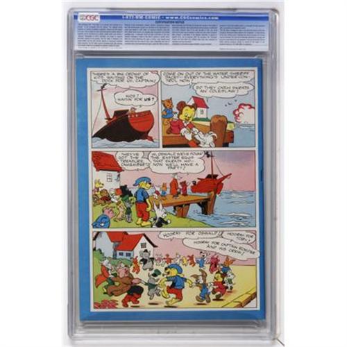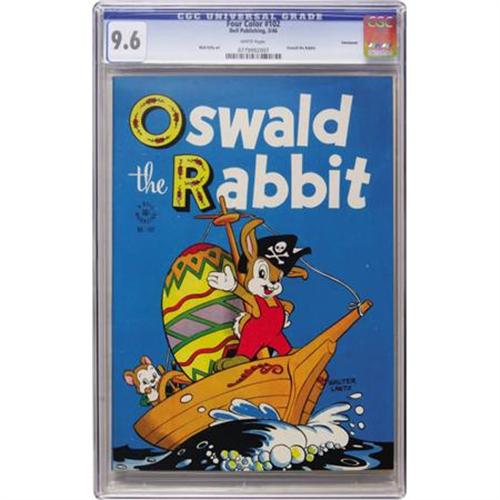 <B>Four Color #102 Oswald the Rabbit - Vancouver pedigree (Dell, 1946) CGC NM+ 9.6 White pages.</B></I> This is the only copy graded above 9.0 by CGC to date, and it's simply beautiful. Disney recently re-acquired the rights to this character (in a "trade" for announcer Al Michaels, bizarrely enough), and it will be interesting to see how Oswald is used in years to come and whether a new generation will get to know Oswald. As Mr. Michaels might say, being the winning bidder for this stunning copy would be "huge!" Overstreet 2007 NM- 9.2 value = $255. CGC census 6/07: 1 in 9.6, none higher.<BR><BR><b>Shipping:</b> Comics - Slabbed (certified) (<a target="_blank" href="http://www.heritageauctions.com/common/shipping.php">view shipping information</a>)