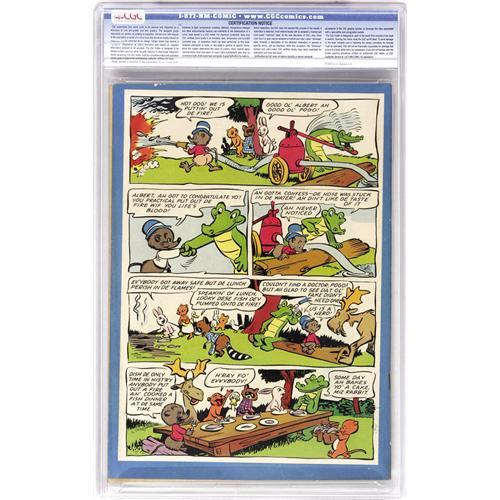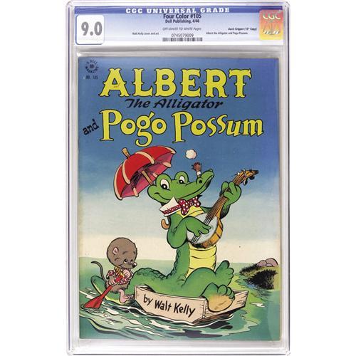<B>Four Color #105 Albert the Alligator and Pogo Possum - Davis Crippen ("D" Copy) pedigree (Dell, 1946) CGC VF/NM 9.0 Off-white to white pages.</B></I> Walt Kelly's politically-minded possum and his swamp-critter pals take center stage in this issue, after a run of featured appearances in <B>Animal Comics</B></I>. Not only is this attractive copy the highest graded of only two certified by CGC to date, but the second only clocks in at a 5.0. Overstreet 2006 VF/NM 9.0 value = $784; NM- 9.2 value = $1,100. CGC census 7/06: 1 in 9.0, none higher. <I>From the Crippen Collection.</B></I> <BR><BR><B>Important notice:</B> Heritage usually auctions material at the rate of 200-250 lots per hour. On some occasions eBay Live bid software or the Internet may not be able to keep up with the pace of the auction. We recommend placing a realistic absentee bid now as insurance to avoid disappointment. Occasionally the auctioneer may eliminate or reject an eBay Live bid, and the auctioneer may also reopen a lot after the close of the eBay live bidding (usually because we missed an audience bid), and may reject your bid even if it shows you as the winning bidder. By bidding via eBay Live, you agree that Heritage may award the lot to another bidder at its sole discretion under the circumstances described above or any other reasonable circumstances. Since eBay bids are not shown to us until we open the lot on the floor, we treat those bids just like floor bids. In most cases the floor responds before the eBay bid is presented to us, due to Internet lag time, so for consistency we have made it a policy that floor bids are always considered first over tie eBay live bids. Also please note that all Heritage lots purchased through eBay Live carry a 22.5% Buyer's Premium. Please make sure you read the Terms and Conditions before you bid. This lot is being auctioned in conjunction with a live floor auction by Heritage Auction Galleries. All final auction and invoice information will be supplied by Heritage Auction Galleries, and all other information should be considered preliminary. Lot:41001 <BR><BR><B>Winning Notification and Billing:</B> After the FINAL session in this auction is complete, Heritage will send e-mail and snail mail invoices. This process normally takes several days. All final auction and invoice information will be supplied by Heritage Auction Galleries, and all other information should be considered preliminary. <BR><BR>This auction will be conducted on a live auction floor and over the Internet through eBay Live. If you choose to place an absentee bid, please take a moment to <font color='#0000ff'><u><a href='http://pages.ebay.com/liveauctions/help/before/laabsentee.html'>learn how eBay Live absentee bidding works</a></u></font><font color='#000000'>