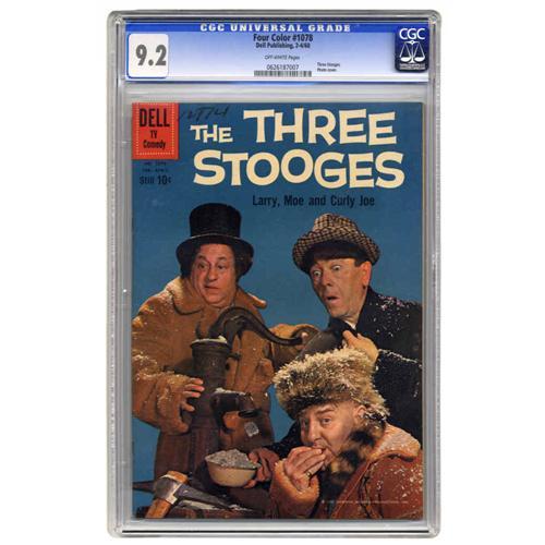 <B>Four Color #1078 Three Stooges (Dell, 1960) CGC NM- 9.2 Off-white pages.</B></I> With a photo cover featuring Larry, Moe, and Curly Joe. Overstreet 2005 NM- 9.2 value = $200. CGC census 12/05: 2 in 9.2, 3 higher.