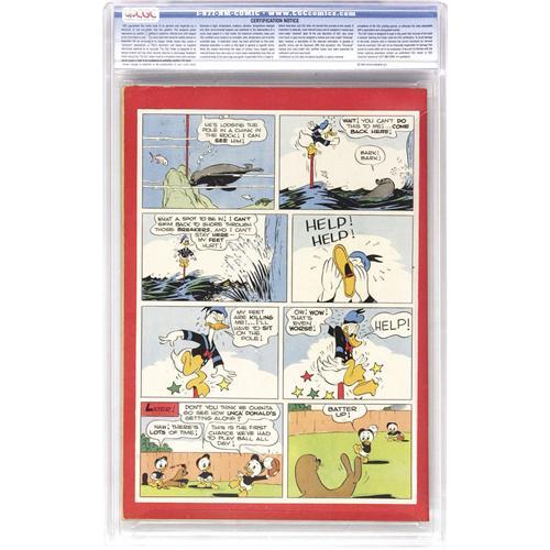 <B>Four Color #108 Donald Duck in "The Terror of the River" - Davis Crippen ("D" Copy) pedigree (Dell, 1946) CGC VF+ 8.5 Off-white pages.</B></I> Donald Duck, with Huey, Dewey, and Louie, star in "Terror of the River" by Carl Barks. Donald's seventh self-titled comic features a wondrous 52 pages of brilliant stories and art. A great comic that's on a lot of collectors' want lists. Overstreet 2006 VF 8.0 value = $1,105; VF/NM 9.0 value = $1,853. CGC census 7/06: 3 in 8.5, 8 higher. <I>From the Crippen Collection.</B></I> <BR><BR><B>Important notice:</B> Heritage usually auctions material at the rate of 200-250 lots per hour. On some occasions eBay Live bid software or the Internet may not be able to keep up with the pace of the auction. We recommend placing a realistic absentee bid now as insurance to avoid disappointment. Occasionally the auctioneer may eliminate or reject an eBay Live bid, and the auctioneer may also reopen a lot after the close of the eBay live bidding (usually because we missed an audience bid), and may reject your bid even if it shows you as the winning bidder. By bidding via eBay Live, you agree that Heritage may award the lot to another bidder at its sole discretion under the circumstances described above or any other reasonable circumstances. Since eBay bids are not shown to us until we open the lot on the floor, we treat those bids just like floor bids. In most cases the floor responds before the eBay bid is presented to us, due to Internet lag time, so for consistency we have made it a policy that floor bids are always considered first over tie eBay live bids. Also please note that all Heritage lots purchased through eBay Live carry a 22.5% Buyer's Premium. Please make sure you read the Terms and Conditions before you bid. This lot is being auctioned in conjunction with a live floor auction by Heritage Auction Galleries. All final auction and invoice information will be supplied by Heritage Auction Galleries, and all other information should be considered preliminary. Lot:41001 <BR><BR><B>Winning Notification and Billing:</B> After the FINAL session in this auction is complete, Heritage will send e-mail and snail mail invoices. This process normally takes several days. All final auction and invoice information will be supplied by Heritage Auction Galleries, and all other information should be considered preliminary. <BR><BR>This auction will be conducted on a live auction floor and over the Internet through eBay Live. If you choose to place an absentee bid, please take a moment to <font color='#0000ff'><u><a href='http://pages.ebay.com/liveauctions/help/before/laabsentee.html'>learn how eBay Live absentee bidding works</a></u></font><font color='#000000'>