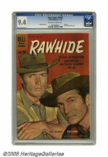 <B>Four Color #1097 Rawhide (Dell, 1960) CGC NM 9.4 Off-white to white pages.</B></I> Photo cover featuring Clint Eastwood (as Rowdy Yates) and Eric Fleming (as Gil Favor). Russ Manning art. Overstreet 2005 NM- 9.2 value = $230. CGC census 2/05: 1 in 9.4, none higher.