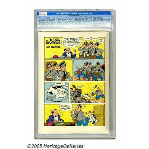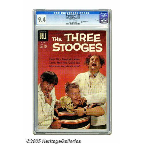 <B>Four Color #1127 The Three Stooges - File Copy (Dell, 1960) CGC NM 9.4 Off-white pages.</B></I> It's ""zany photo cover"" time for the Three Stooges... gee, they're usually so dignified! Only one copy of the issue has been graded higher than this one by CGC to date. Overstreet 2005 NM- 9.2 value = $200. CGC census 7/05: 1 in 9.4, 1 higher. <I>From the Random House Archives.</B></I> <BR><BR><B>Important notice:</B> Heritage usually auctions material at the rate of 200-250 lots per hour. On some occasions eBay Live bid software or the Internet may not be able to keep up with the pace of the auction. We recommend placing a realistic absentee bid now as insurance to avoid disappointment. Occasionally the auctioneer may eliminate or reject an eBay Live bid, and the auctioneer may also reopen a lot after the close of the eBay live bidding (usually because we missed an audience bid), and may reject your bid even if it shows you as the winning bidder. By bidding via eBay Live, you agree that Heritage may award the lot to another bidder at its sole discretion under the circumstances described above or any other reasonable circumstances. Since eBay bids are not shown to us until we open the lot on the floor, we treat those bids just like floor bids. In most cases the floor responds before the eBay bid is presented to us, due to Internet lag time, so for consistency we have made it a policy that floor bids are always considered first over tie eBay live bids. Also please note that all Heritage lots purchased through eBay Live carry a 20% Buyer's Premium. Please make sure you read the Terms and Conditions before you bid. This lot is being auctioned in conjunction with a live floor auction by Heritage Galleries & Auctioneers. All final auction and invoice information will be supplied by Heritage Galleries & Auctioneers, and all other information should be considered preliminary. Lot:3178 <BR><BR><B>Winning Notification and Billing:</B> After the FINAL session in this auction i