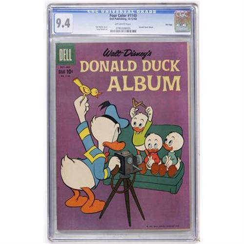 <B>Four Color #1140 Donald Duck Album - File Copy (Dell, 1960) CGC NM 9.4 Off-white pages.</B></I> Carl Barks cover. Overstreet 2007 NM- 9.2 value = $95. CGC census 10/07: 2 in 9.4, 1 higher.<BR><BR><b>Shipping:</b> Comics - Slabbed (certified) (<a target="_blank" href="http://www.heritageauctions.com/common/shipping.php">view shipping information</a>)