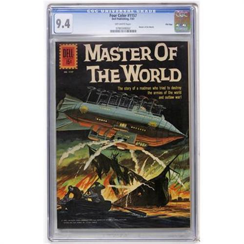 <B>Four Color #1157 Master of the World - File Copy (Dell, 1961) CGC NM 9.4 Off-white pages.</B></I> Master of the World. Painted cover. Overstreet 2007 NM- 9.2 value = $85. CGC census 10/07: 1 in 9.4, 1 higher.<BR><BR><b>Shipping:</b> Comics - Slabbed (certified) (<a target="_blank" href="http://www.heritageauctions.com/common/shipping.php">view shipping information</a>)