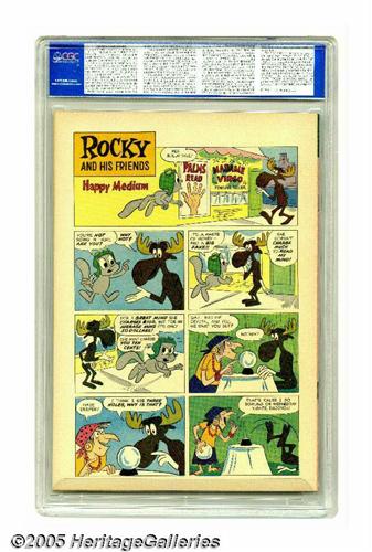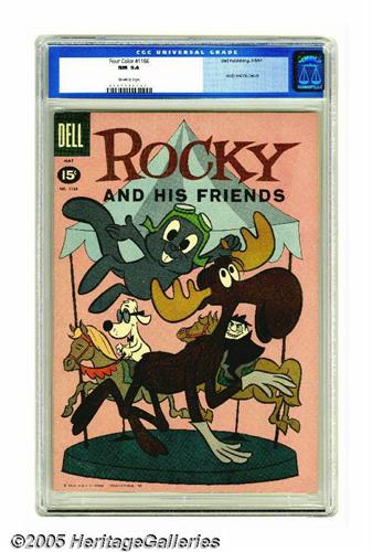 <B>Four Color #1166 Rocky and His Friends (Dell, 1961) CGC NM 9.4.</B></I> <I>Now</B></I> here's something we hope you'll <I>really</B></I> like! Namely Rocky the Flying Squirrel and his friends Bullwinkle and Mr. Peabody (Boris Badenov's not exactly a <I>friend</B></I>, but he's here too). Overstreet 2005 NM- 9.2 value = $350. CGC census 3/05: 2 in 9.4, 1 higher.