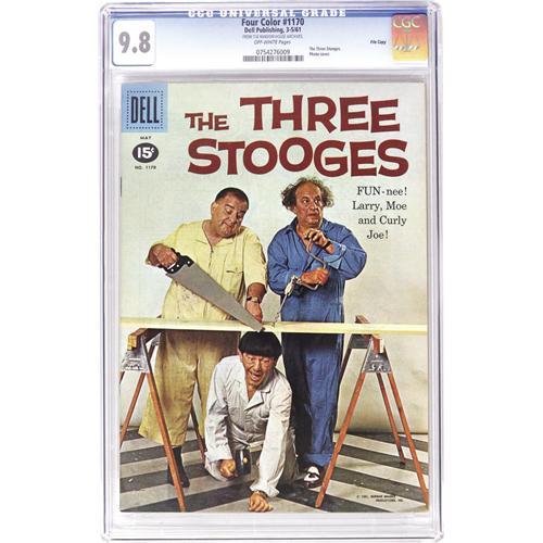 <B>Four Color #1170 The Three Stooges - File Copy (Dell, 1961) CGC NM/MT 9.8 Off-white pages.</B></I> Here's a pristine copy of the fourth of five <B>Four Color</B></I> outings for the Stooges. Overstreet 2006 NM- 9.2 value = $215. CGC census 5/06: 2 in 9.8, none higher. <I>From the Random House Archives.</B></I> <BR><BR><B>Important notice:</B> Heritage usually auctions material at the rate of 200-250 lots per hour. On some occasions eBay Live bid software or the Internet may not be able to keep up with the pace of the auction. We recommend placing a realistic absentee bid now as insurance to avoid disappointment. Occasionally the auctioneer may eliminate or reject an eBay Live bid, and the auctioneer may also reopen a lot after the close of the eBay live bidding (usually because we missed an audience bid), and may reject your bid even if it shows you as the winning bidder. By bidding via eBay Live, you agree that Heritage may award the lot to another bidder at its sole discretion under the circumstances described above or any other reasonable circumstances. Since eBay bids are not shown to us until we open the lot on the floor, we treat those bids just like floor bids. In most cases the floor responds before the eBay bid is presented to us, due to Internet lag time, so for consistency we have made it a policy that floor bids are always considered first over tie eBay live bids. Also please note that all Heritage lots purchased through eBay Live carry a 22.5% Buyer's Premium. Please make sure you read the Terms and Conditions before you bid. This lot is being auctioned in conjunction with a live floor auction by Heritage Auction Galleries. All final auction and invoice information will be supplied by Heritage Auction Galleries, and all other information should be considered preliminary. Lot:41001 <BR><BR><B>Winning Notification and Billing:</B> After the FINAL session in this auction is complete, Heritage will send e-mail and snail mail invoices. This process normally takes several days. All final auction and invoice information will be supplied by Heritage Auction Galleries, and all other information should be considered preliminary. <BR><BR>This auction will be conducted on a live auction floor and over the Internet through eBay Live. If you choose to place an absentee bid, please take a moment to <font color='#0000ff'><u><a href='http://pages.ebay.com/liveauctions/help/before/laabsentee.html'>learn how eBay Live absentee bidding works</a></u></font><font color='#000000'>