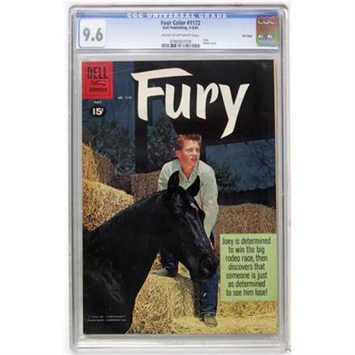 <B>Four Color #1172 Fury File Copy (Dell, 1961) CGC NM+ 9.6 Cream to off-white pages.</B></I> <B>Fury</B></I>. Photo cover. Overstreet 2007 NM- 9.2 value = $100. CGC census 9/07: 1 in 9.6, none higher.<BR><BR><b>Shipping:</b> Comics - Slabbed (certified) (<a target="_blank" href="http://www.heritageauctions.com/common/shipping.php">view shipping information</a>)