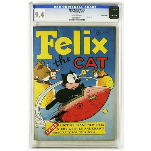 <B>Four Color #135 Felix the Cat - Crowley Copy pedigree (Dell, 1947) CGC NM 9.4 Off-white pages.</B></I> Felix boards a rocketship to do a little planet hopping on this issue's colorful cover. Otto Messmer supplies equally colorful art throughout this fun comic, which is the second <B>Four Color</B></I> issue to feature new Felix stories rather than strip reprints. This pedigreed example has zoomed to the very top of the current CGC census. Overstreet 2005 NM- 9.2 value = $380. CGC census 12/05: 1 in 9.4, none higher.