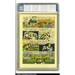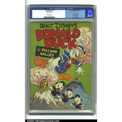 Four Color #147 (Dell, 1947) CGC VF+ 8.5 Off-white pages. Donald Duck appears this issue in "Volcano Valley", rendered by the Duck Master himself, Carl Barks. In it's massive run of over 1,300 issues, Four Color's most valuable comics have always been of Disney cartoon characters, in particular these famous Barks books. This copy looks nearly perfect, exhibiting a light dust shadow on the back cover and an impacted corner. Overstreet 2002 VF 8.0 value = $560. Important notice: We expect to be auctioning lots at the rate of 200-250 per hour. Sometimes eBay Premier live bid software cannot keep up with that pace, so we strongly recommend that you place a realistic proxy bid now as insurance to avoid disappointment. Also please note that all Heritage/CAA lots purchased through eBay Premier carry a 20% Buyer's Premium.