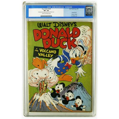 <B>Four Color #147 Donald Duck in Volcano Valley (Dell, 1947) CGC VF+ 8.5 Cream to off-white pages.</B></I> Donald and the boys travel down to South America in this issue's long comic adventure story, written and drawn by Carl Barks. CGC notes, "Moderate tanning edges interior front and back cover." Overstreet 2005 VF 8.0 value = $714; VF/NM 9.0 value = $1,155. CGC census 12/05: 5 in 8.5, 2 higher.