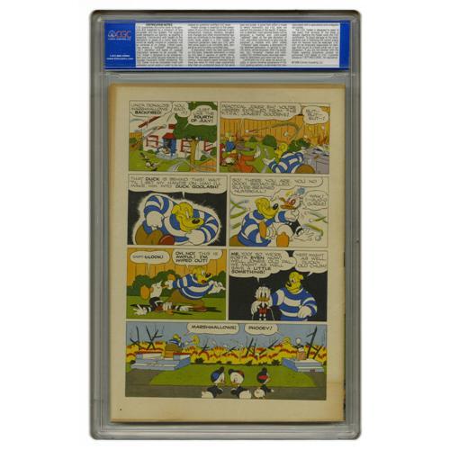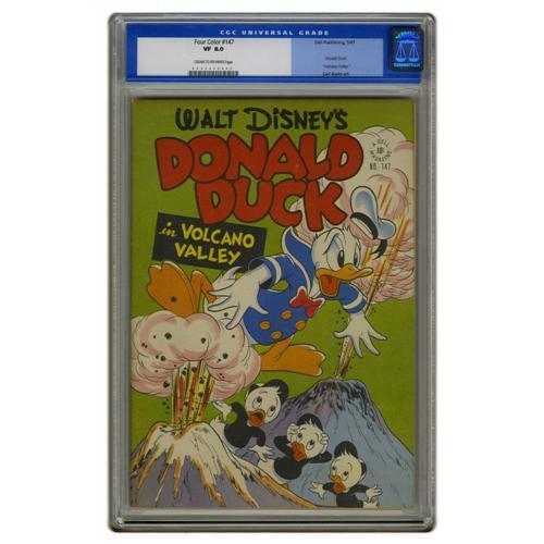<B>Four Color #147 Donald Duck in Volcano Valley (Dell, 1947) CGC VF 8.0 Cream to off-white pages.</B></I> Some of the best Carl Barks yarns involved journeys to faraway lands, and this issue is one of the more famous such expeditions. The story and art are by Barks. Overstreet 2006 VF 8.0 value = $723. CGC census 1/06: 5 in 8.0, 7 higher.