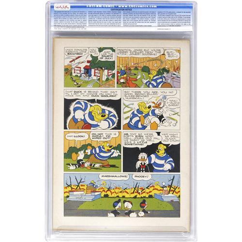<B>Four Color #147 Donald Duck in "Volcano Valley" - Davis Crippen ("D" Copy) pedigree (Dell, 1947) CGC VF/NM 9.0 Off-white to white pages.</B></I> Donald and his three nephews head for South America in this issue's Carl Barks-drawn adventure. The cover is by Carl Buettner. Overstreet 2006 VF/NM 9.0 value = $1,212; NM- 9.2 value = $1,700. CGC census 7/06: 2 in 9.0, 2 higher. <I>From the Crippen Collection.</B></I> <BR><BR><B>Important notice:</B> Heritage usually auctions material at the rate of 200-250 lots per hour. On some occasions eBay Live bid software or the Internet may not be able to keep up with the pace of the auction. We recommend placing a realistic absentee bid now as insurance to avoid disappointment. Occasionally the auctioneer may eliminate or reject an eBay Live bid, and the auctioneer may also reopen a lot after the close of the eBay live bidding (usually because we missed an audience bid), and may reject your bid even if it shows you as the winning bidder. By bidding via eBay Live, you agree that Heritage may award the lot to another bidder at its sole discretion under the circumstances described above or any other reasonable circumstances. Since eBay bids are not shown to us until we open the lot on the floor, we treat those bids just like floor bids. In most cases the floor responds before the eBay bid is presented to us, due to Internet lag time, so for consistency we have made it a policy that floor bids are always considered first over tie eBay live bids. Also please note that all Heritage lots purchased through eBay Live carry a 22.5% Buyer's Premium. Please make sure you read the Terms and Conditions before you bid. This lot is being auctioned in conjunction with a live floor auction by Heritage Auction Galleries. All final auction and invoice information will be supplied by Heritage Auction Galleries, and all other information should be considered preliminary. Lot:41001 <BR><BR><B>Winning Notification and Billing:</B> After the FINAL session in this auction is complete, Heritage will send e-mail and snail mail invoices. This process normally takes several days. All final auction and invoice information will be supplied by Heritage Auction Galleries, and all other information should be considered preliminary. <BR><BR>This auction will be conducted on a live auction floor and over the Internet through eBay Live. If you choose to place an absentee bid, please take a moment to <font color='#0000ff'><u><a href='http://pages.ebay.com/liveauctions/help/before/laabsentee.html'>learn how eBay Live absentee bidding works</a></u></font><font color='#000000'>